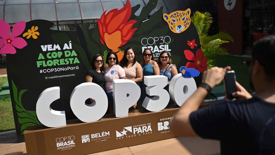 Menschen posieren vor dem Logo der COP30 im brasilianischen Belém