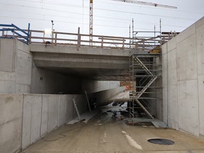 In den vergangenen Monaten wuchs die neue Mühlbachtrasse Stück für Stück zusammen. Anfang Mai haben Hydraulikpressen zwei große Blöcke unter die Bahngleise gezogen. Bei diesem spektakulärenVorhaben war besondere Präzision gefragt. Der dazwischenliegende Block unterhalb des mittleren Bahnsteigs wurde anschließend betoniert. Die Übergänge zwischen den einzelnen Blöcken sind durch umlaufende Fugenbänder abgedichtet,sodass kein Grund- und Schichtenwasser in die Unterführung eindringen kann. Bei einer Gleissperrpause im Sommer haben Baufachleute die Hilfsbrücken der Gleise 3 und 4 ausgebaut und die Gleise neu verlegt sowie den Mittelbahnsteig hergestellt,der ebenfalls durch eine Hilfsbrücke ersetzt war.
