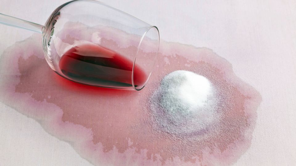 Salz in Rotweinlache: Ein trockener Fleck sieht heller aus als ein nasser