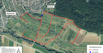 Alle Streuobstwiesenbewirtschafter können ihr Baumschnittgut bis Sonntag,8. März,an den in der Karte als blauen Punkt dargestellten Sammelplatz ablegen. Vor Ort ist der Platz mit einem Schild markiert. Bewirtschafter,deren Grundstück an die Sammelrouten angrenzen,können ihr Schnittgut an ihren Grundstücksrand direkt entlang der Route ablegen. Diese ist in der Karte mit roten Linien eingezeichnet. Im März wird ein Unternehmer entlang der Sammelroute und an den Sammelplätzen jegliches kompakt aufgehäufte Streuobst-Schnittgut unentgeltlich einsammeln und abfahren. Das Material wird zu Hackschnitzel weiterverarbeitet.