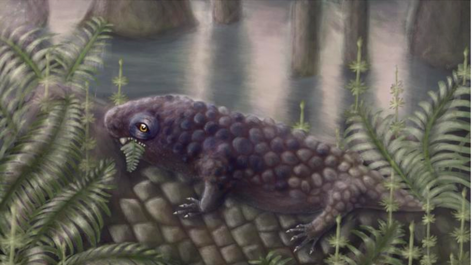 Tyrannoroter heberti frisst Farn (grafische Darstellung): Das Wirbeltier lebte vor 307 Millionen Jahren