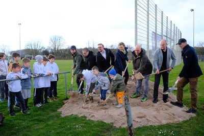 Foto (Stadt Göppingen): Bald entsteht an dieser Stelle ein Kunstrasenplatz. An den Spaten sind Baubürgermeisterin Eva Noller,Vereinsvorstand Martin Quintus (2 v.r.) sowie weitere am Projekt beteiligte Gäste.