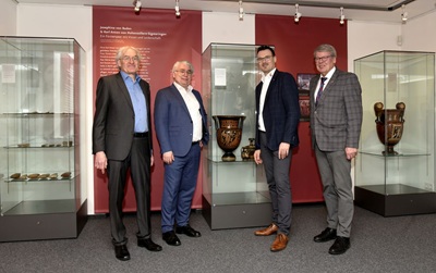 Foto (Alamannenmuseum Ellwangen,Ursula Maier): Die Sonderausstellung „Leidenschaft und Forschung * Die archäologische Sammlung Hohenzollern“ wurde am Donnerstag im Alamannenmuseum eröffnet. Das Bild zeigt vor den ausgestellten apulischen Vasen der Sammlung Hohenzollern: Museumsleiter Andreas Gut,Dr. Klaus Georg Kokkotidis vom Landesmuseum Württemberg in Stuttgart,Oberbürgermeister Michael Dambacher sowie den Vorsitzenden des Fördervereins Alamannenmuseum Ellwangen,Werner Kowarsch (von links)