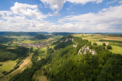 Foto (Patrick Zanker Fotografie,Landratsamt Göppingen): Mit atemberaubenden Ausblicken wartet der Löwenpfad Felsenrunde in Bad Überkingen auf. Vor allem das Naturschutzgebiet Hausener Wand mit seinen markanten Felsen ist ein Highlight des Wanderwegs.