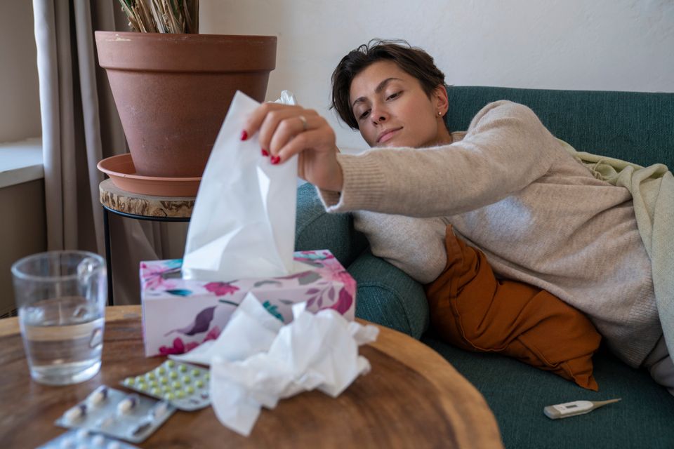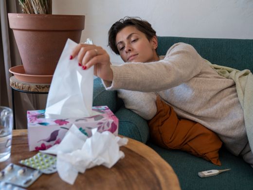 Frau mit Schnupfen: Schmilzt für kranke Beschäftigte bald wieder das Gehalt?