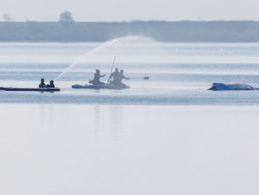 Retter spritzen Wasser auf den Wal