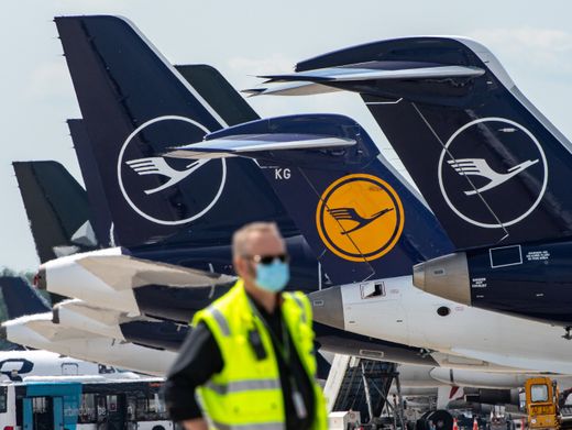 Mann mit Mundschutz vor Lufthansa-Maschinen (Foto aus dem Juni 2020)